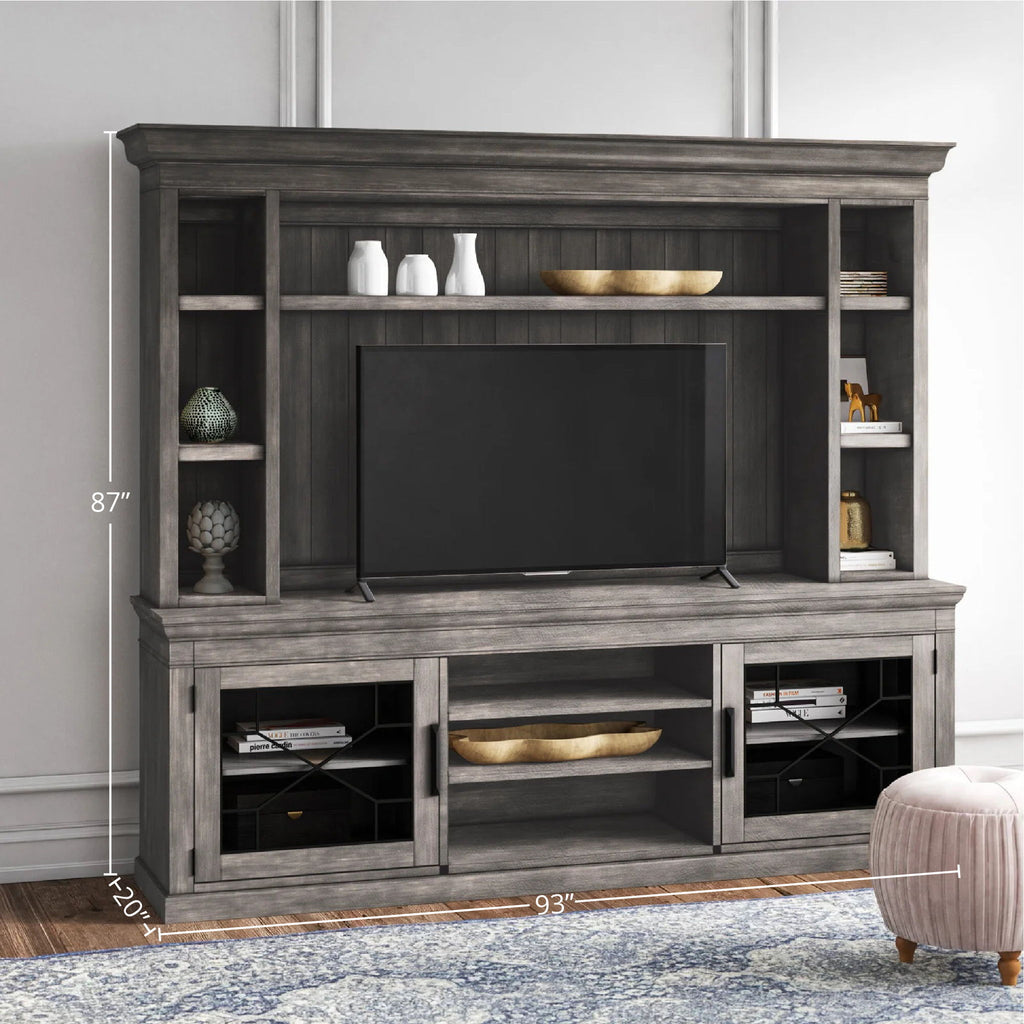 Rich with character, the Sundance collection's Console with Hutch and Backpanel makes a bold statement in style. Perfectly sized for televisions up to 92 inches, it offers storage, display and thoughtful functionality. Its handsome hand-applied, multi-step Sandstone finish complements any room's décor while conveying unique character. Energy-efficient LED lighting with a three-way touch dimmer button highlights the treasures and collectibles you display. A finished backpanel completes the look and adds impressive detailing. Two glass doors with decorative insets provide room for storage and display while three open center shelves are ideal for components. Inspired by the beauty of the great outdoors, this well-designed ensemble conveys modern rustic charm.