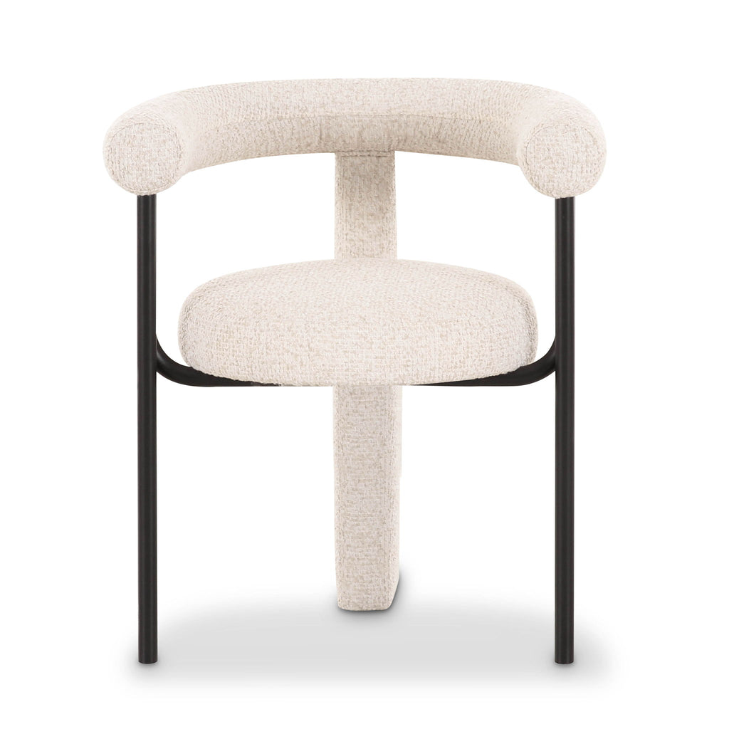 The Synn Dining Chair brings a postmodern punch to your dining space with its sculptural curves and artful tubular design. Wrapped in textured performance boucle, its padded shelter back and sleek arms offer a cozy embrace while tucking neatly under most standard dining tables.