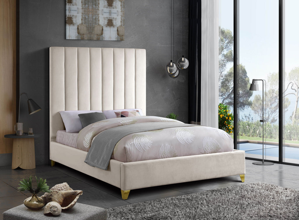 Take the look of your bedroom to new decorative heights with this ultra-modern Via upholstered bed. Sleek velvet upholstery gives this bed a true upscale feel and epitomizes fine living while channel tufting along the headboard keeps the padded material inside plump and aloft, so it cradles your body while you sit up in bed to watch TV or read. Metal legs bring this platform bed up off the floor, allowing clearance below for cleaning and adding to its svelte contemporary profile.