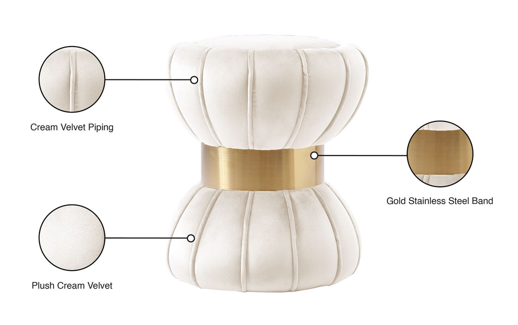 Add modern sophistication to your living space with this chic velvet Vino ottoman stool. Plush velvet curves are bound by a stainless steel band in its center, creating an hourglass shape that is edgy and complements your contemporary home decor.